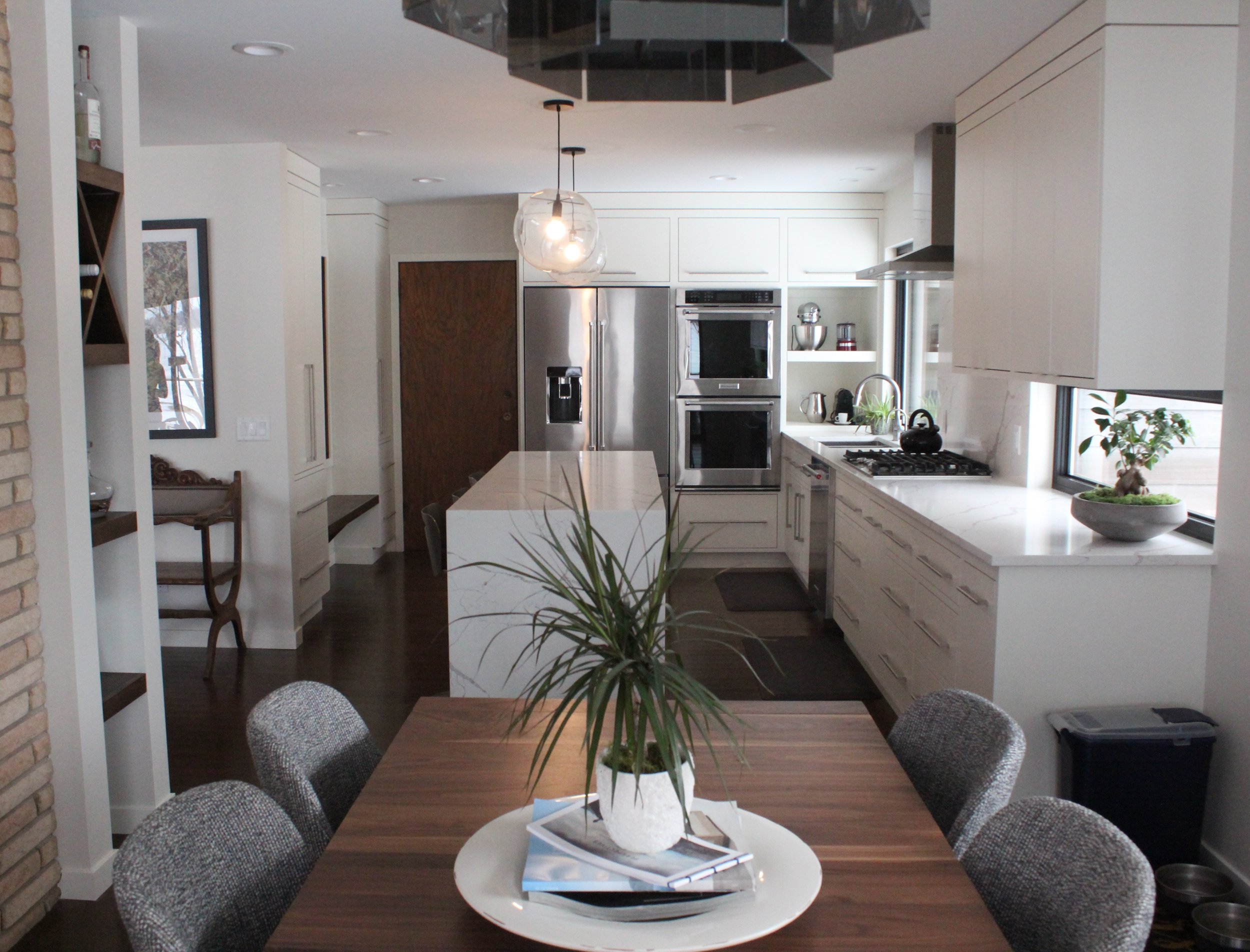 A lovingly maintained mid-century home situated on an expansive lake lot was purchased by a young professional couple with a child on the way. The goal was to retain the character of the home's era while creating an open and light space suitable for a growing family. The kitchen, dining, and living areas were redesigned with the help of the owners, with much thought applied to materials, storage, traffic patterns, and views. The result is a fresh space that takes advantage of the outdoors, will function well for entertaining, and feels true to the home's vintage.